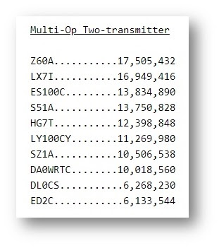 Ανακοινώθηκαν τα ακατέργαστα σκορ για το πρόσφατο CQ WPX RTTY, όπου είχαμε πάρει μέρος στην κατηγορία Μ2. Σύμφωνα μ’ αυτά θα είμαστε στην 7η θέση παγκόσμια, σε μια κατηγορία που αποδείχθηκε μονόλογος των Ευρωπαίων. Ενδιαφέρον έχει το γεγονός ότι οι LZ7A που κονταροχτυπιόμασταν στο live score και τελικά τους είχαμε περάσει για λίγο, δήλωσαν τελικά το ημερολόγιό τους στην κατηγορία ΜΜ και είναι 4οι στον κόσμο, θέση που θα μπορούσαμε κι εμείς να έχουμε αν δηλώναμε το log μας εκεί… Το σκορ μας είναι πολύ καλό αν δεις ότι πίσω μας είναι οι Γερμανοί και οι Ισπανοί! Συγχαρητήρια σε όλους για άλλη μια φορά. Ακατέργαστα σκορ στο CQ WPX RTTY 2018