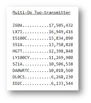 Ανακοινώθηκαν τα ακατέργαστα σκορ για το πρόσφατο CQ WPX RTTY, όπου είχαμε πάρει μέρος στην κατηγορία Μ2. Σύμφωνα μ’ αυτά θα είμαστε στην 7η θέση παγκόσμια, σε μια κατηγορία που αποδείχθηκε μονόλογος των Ευρωπαίων. Ενδιαφέρον έχει το γεγονός ότι οι LZ7A που κονταροχτυπιόμασταν στο live score και τελικά τους είχαμε περάσει για λίγο, δήλωσαν τελικά το ημερολόγιό τους στην κατηγορία ΜΜ και είναι 4οι στον κόσμο, θέση που θα μπορούσαμε κι εμείς να έχουμε αν δηλώναμε το log μας εκεί… Το σκορ μας είναι πολύ καλό αν δεις ότι πίσω μας είναι οι Γερμανοί και οι Ισπανοί! Συγχαρητήρια σε όλους για άλλη μια φορά.