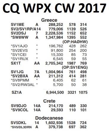 Εκδόθησαν τα αποτελέσματα του CQ WPX CW του περασμένου Μαΐου 2017. Συγχαρητήρια σε όλους τους Ελληνικούς σταθμούς που έλαβαν μέρος. Ο SZ1A είχε λάβει μέρος στην κατηγορία M2 με χειριστές τους SV1CIB, SV1DPI, SV1DPJ, SV2FWV, SV4FFL. Καταφέραμε 6.944.500 πόντους και είμαστε 1οι στην Ελλάδα, 16οι στην Ευρώπη, 23οι στον κόσμο.