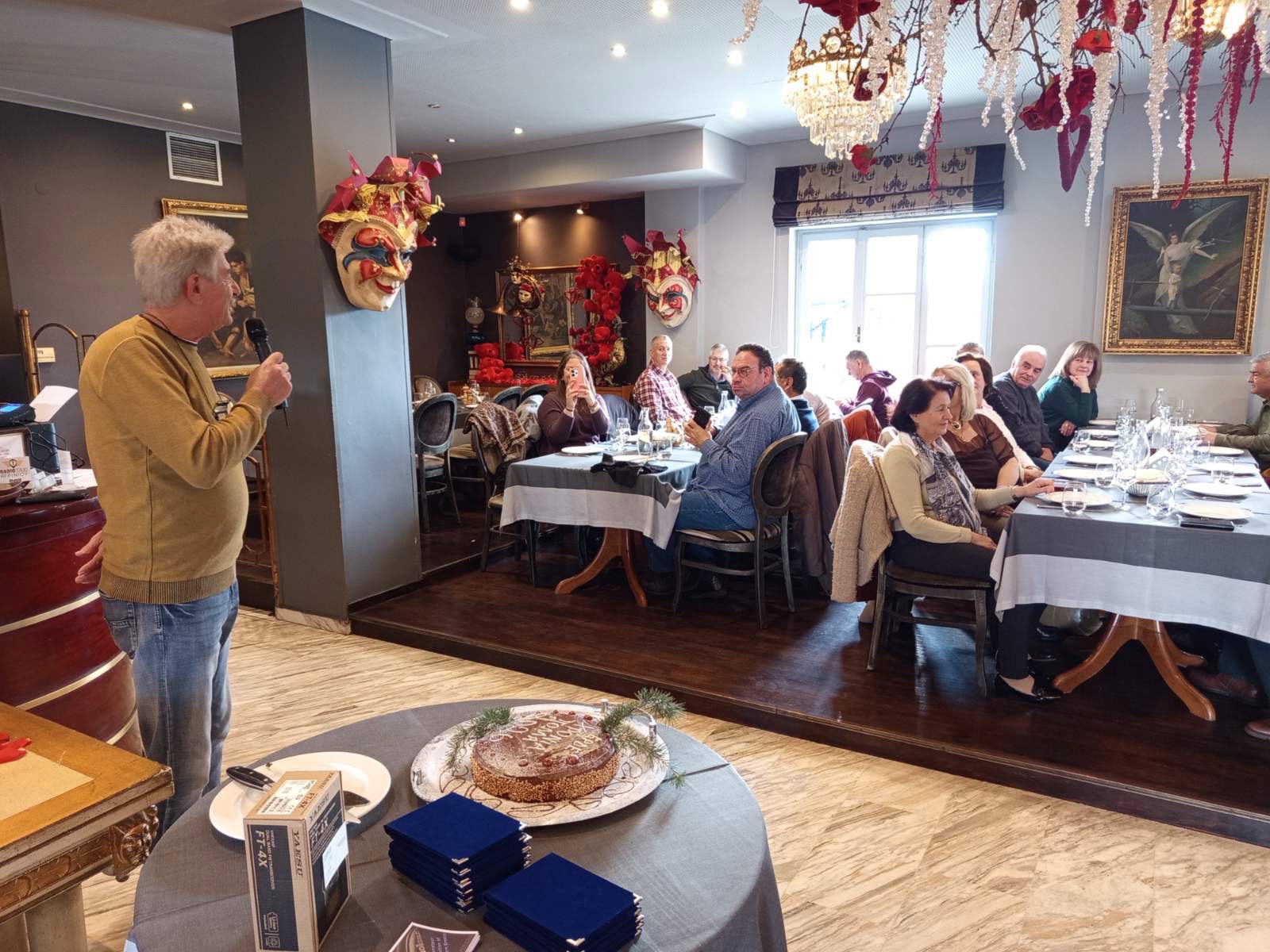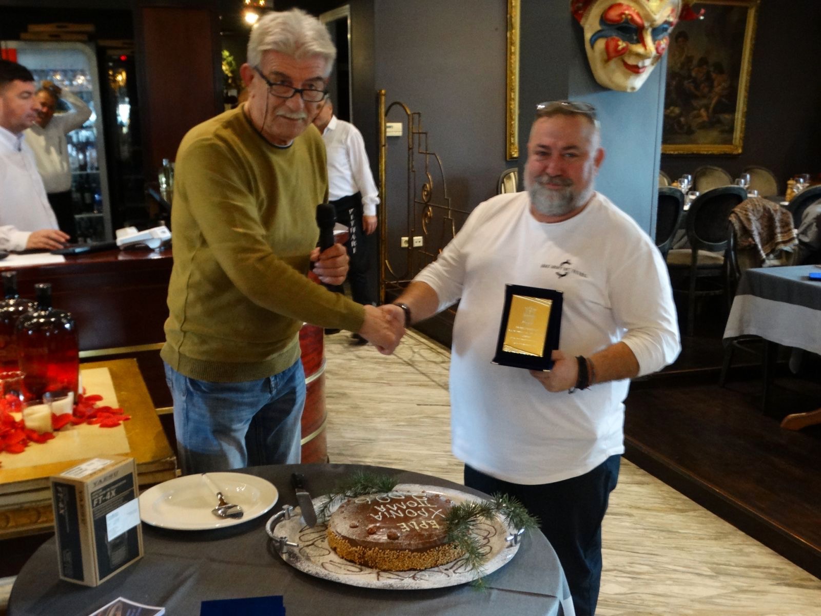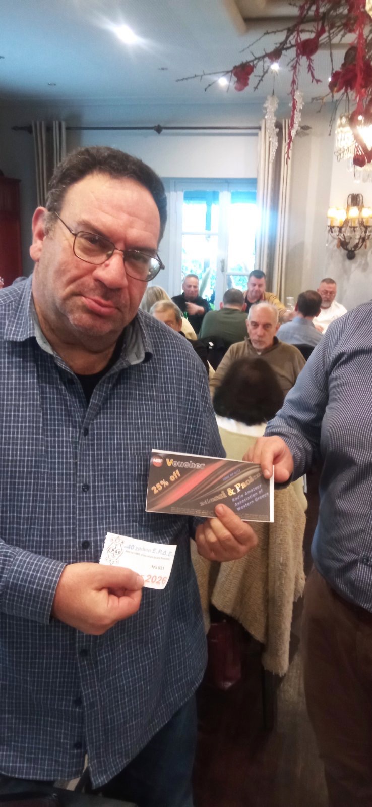 Μετά το καθιερωμένο μεσημεριανό γεύμα, ακολούθησε η κοπή της Βασιλόπιτας. Το φλουρί της χρονιάς βρήκε το μέλος Γιώτα Κασκαβέλη (SV1TIY), η οποία κέρδισε έναν ολοκαίνουργιο φορητό πομποδέκτη VHF/UHF Yaesu FT-4XE, ευγενική προσφορά της εταιρείας Freebytes.